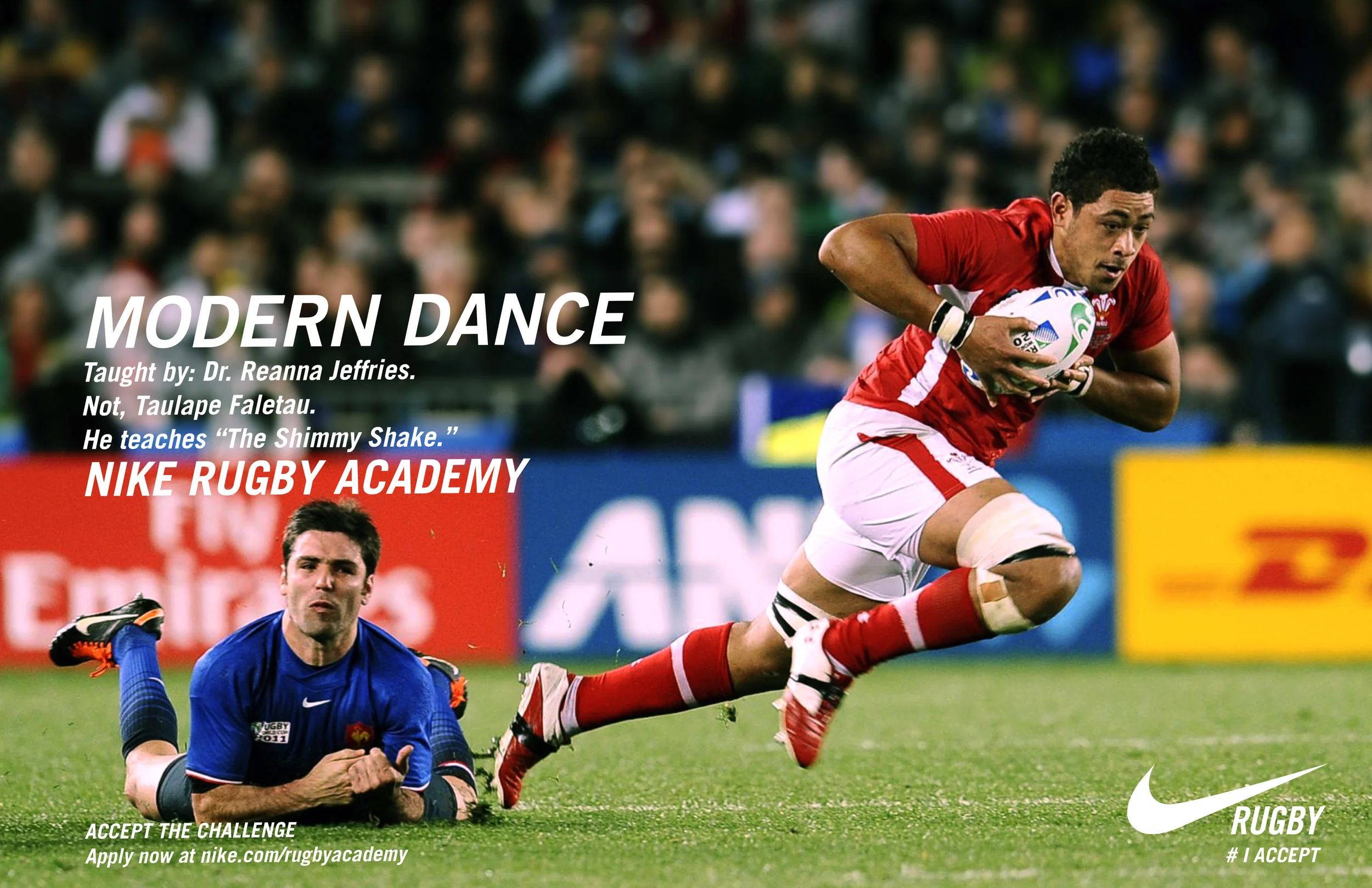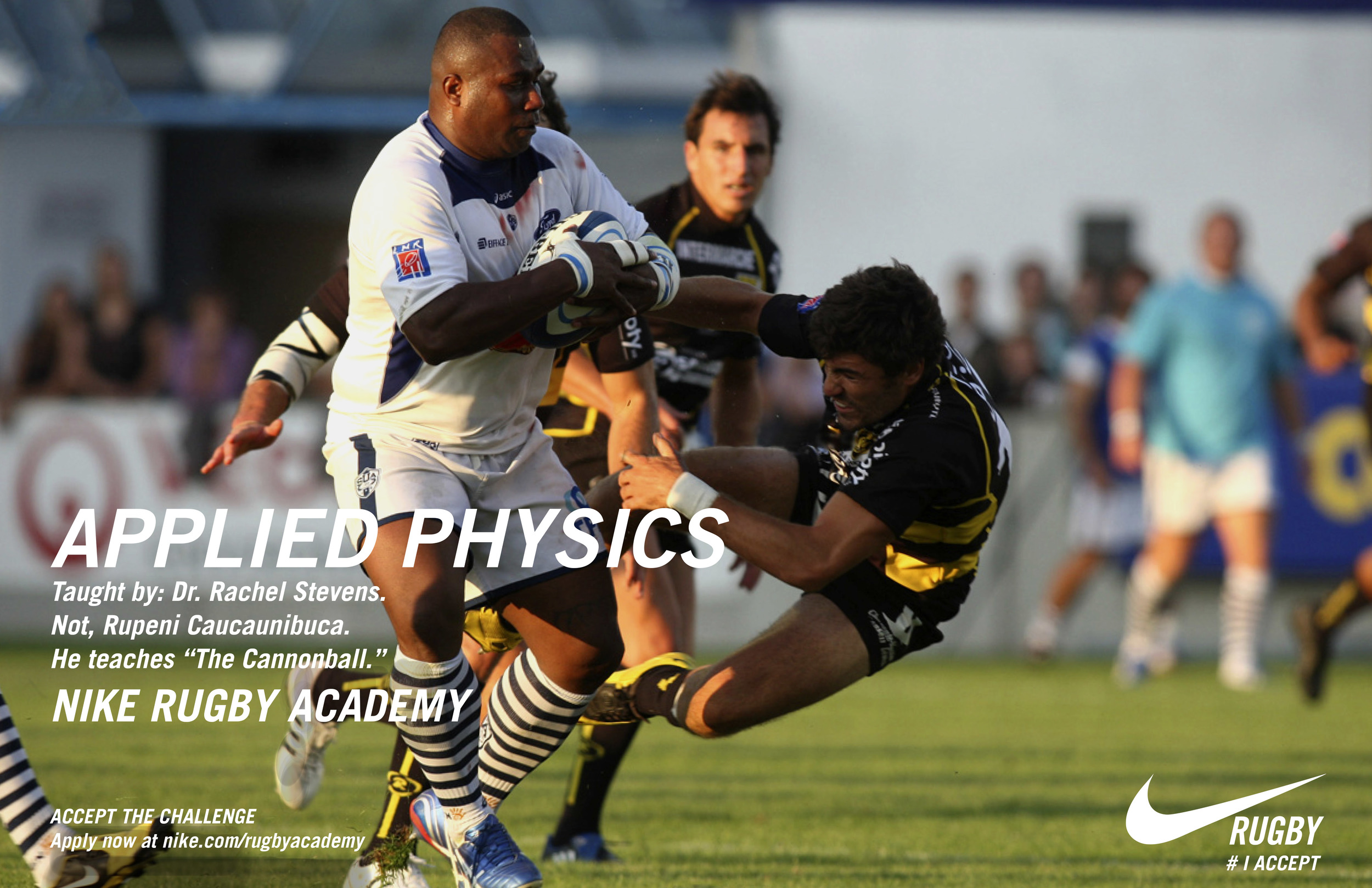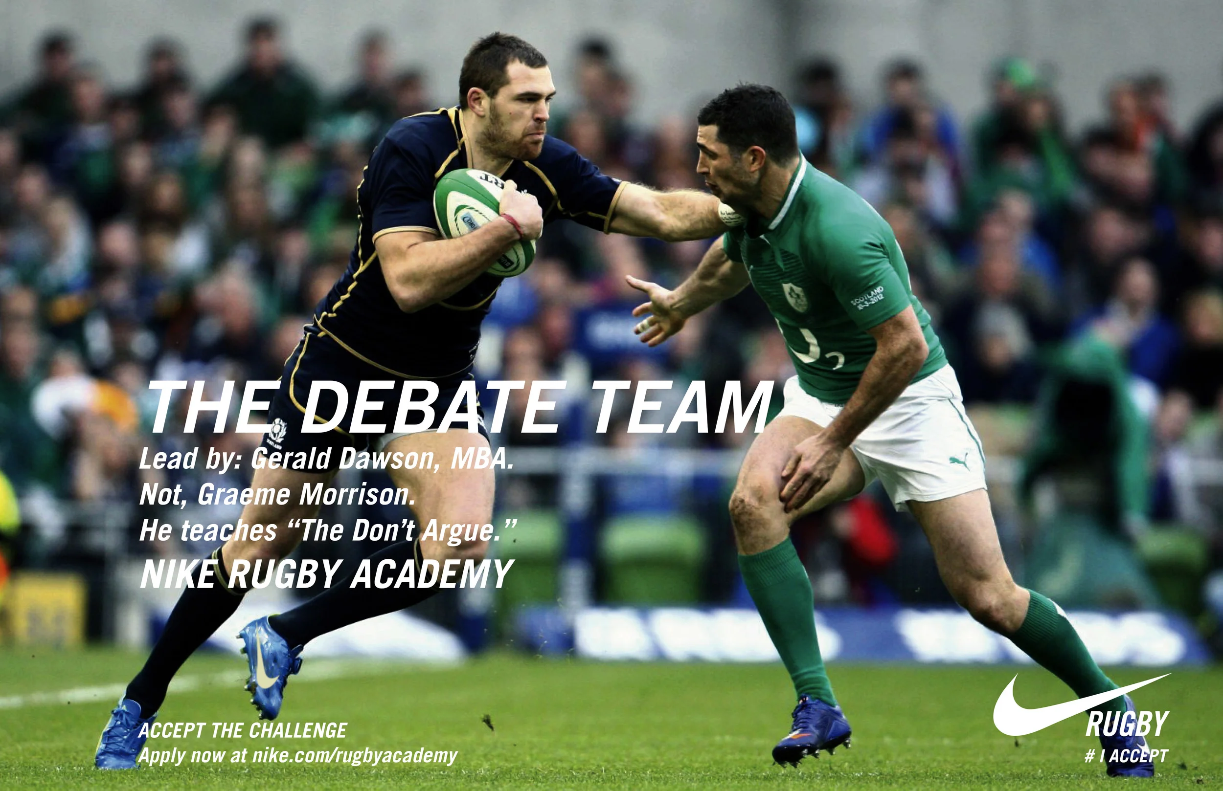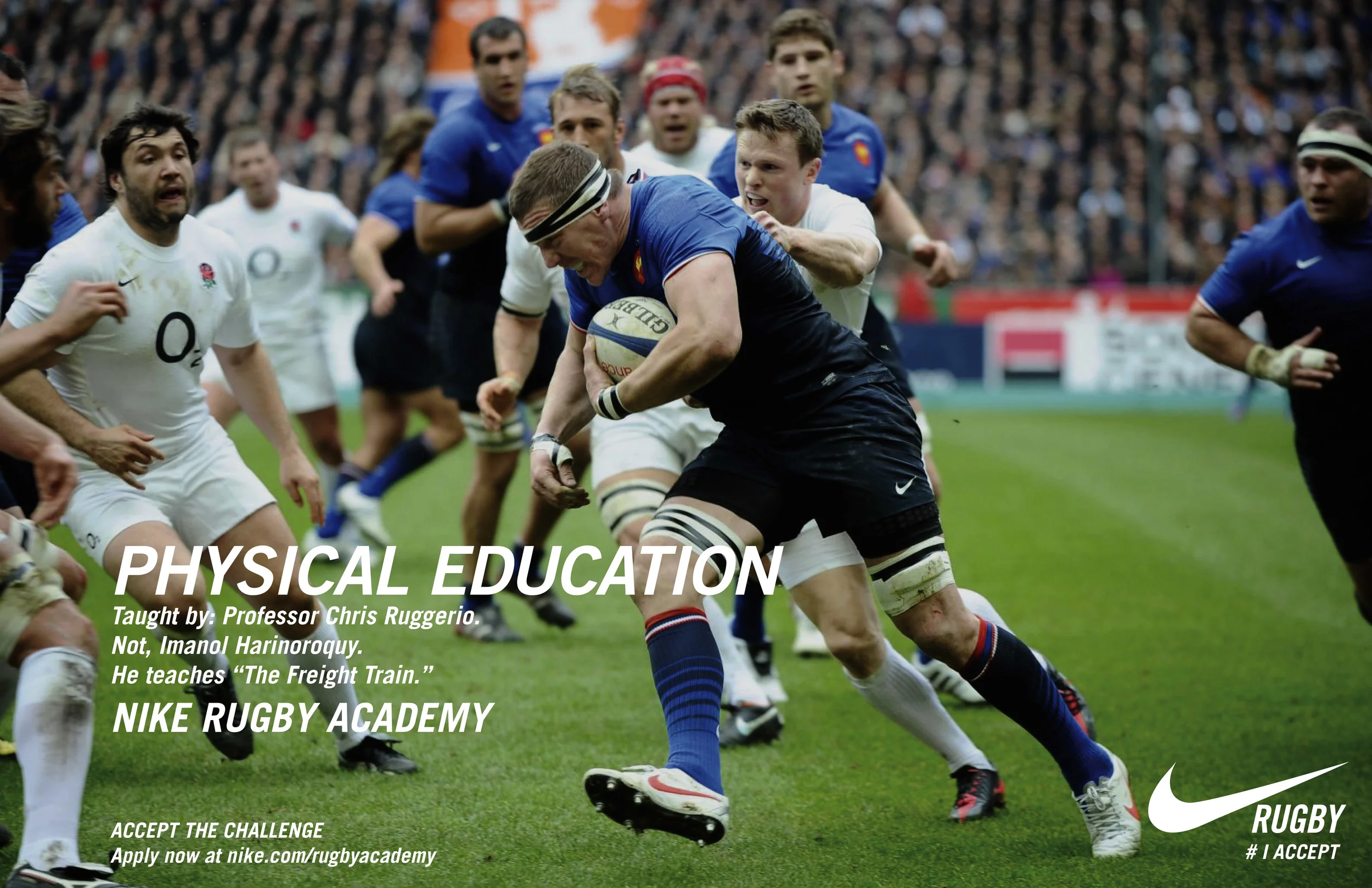 The print invites young rugby athletes to learn about the school and accept the challenge.